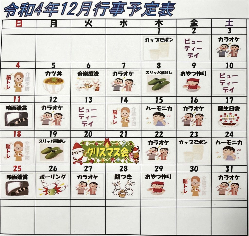 12月は…by momohana2022年11月19日2022年11月20日 本日は来月の行事予定が完成しました。 12月と言えば、クリスマス🎅来月はクリスマス会が開催されます。様々なゲストと楽しいひと時を(ˆ꜆ . ̫ . ).🎀 タグ:12月予定行事