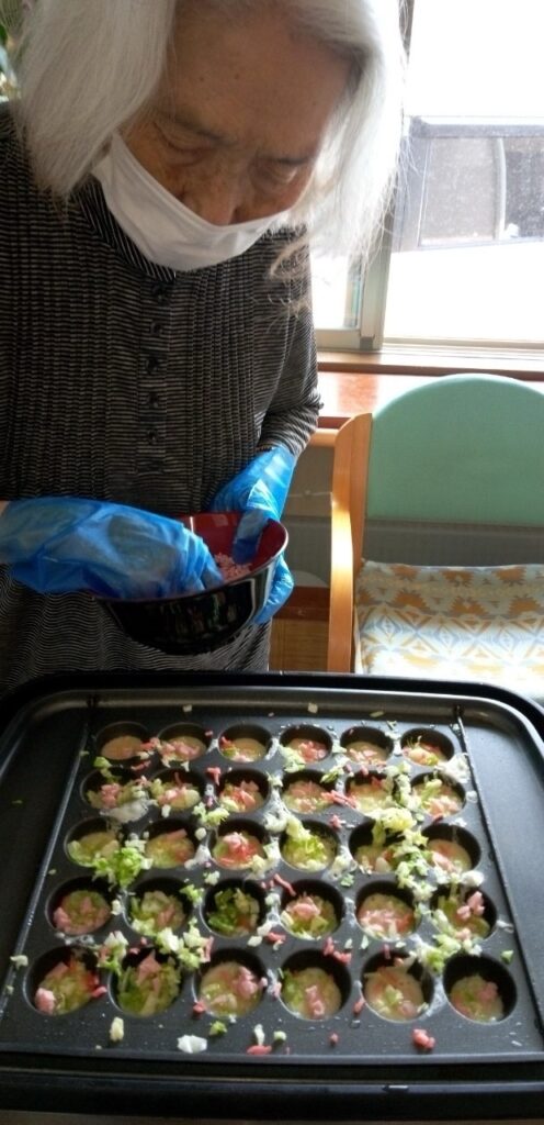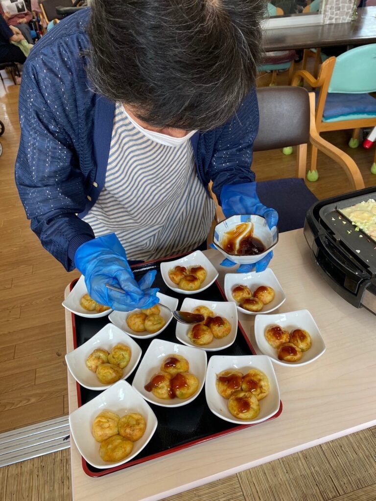 たこ焼きと言ってもタコ🐙は入りません🙅🏼‍♂️喉に詰まりやすい利用者様もいらっしゃるので、魚肉ソーセージを使います🤗