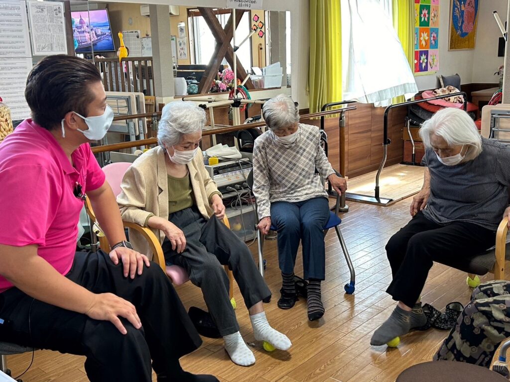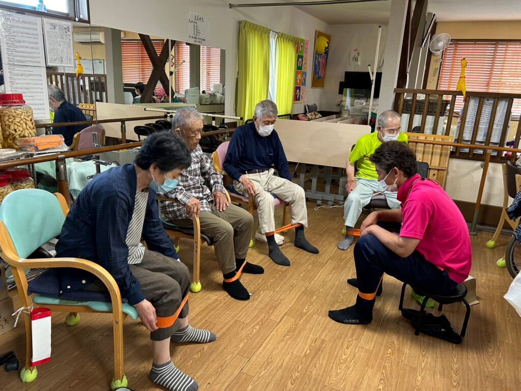 機能訓練指導員の先生と一緒に輪っかやボール、セラバンドを使って訓練してます