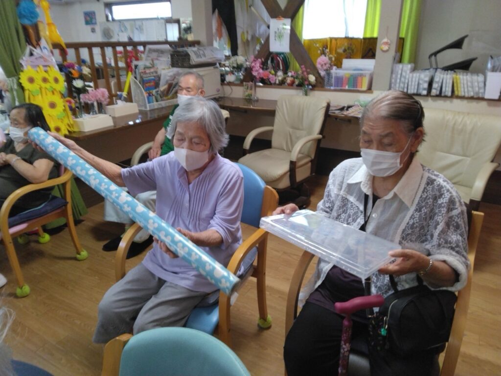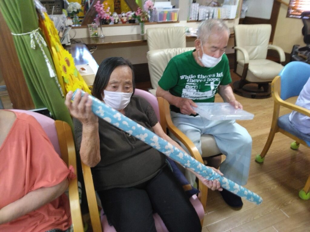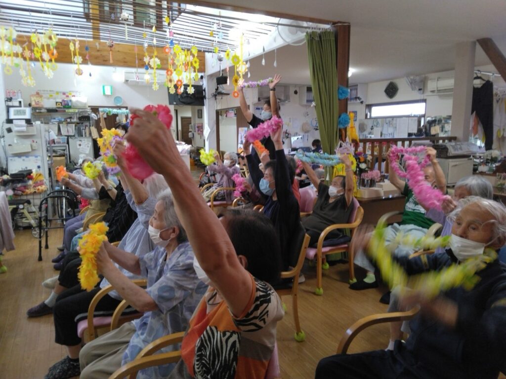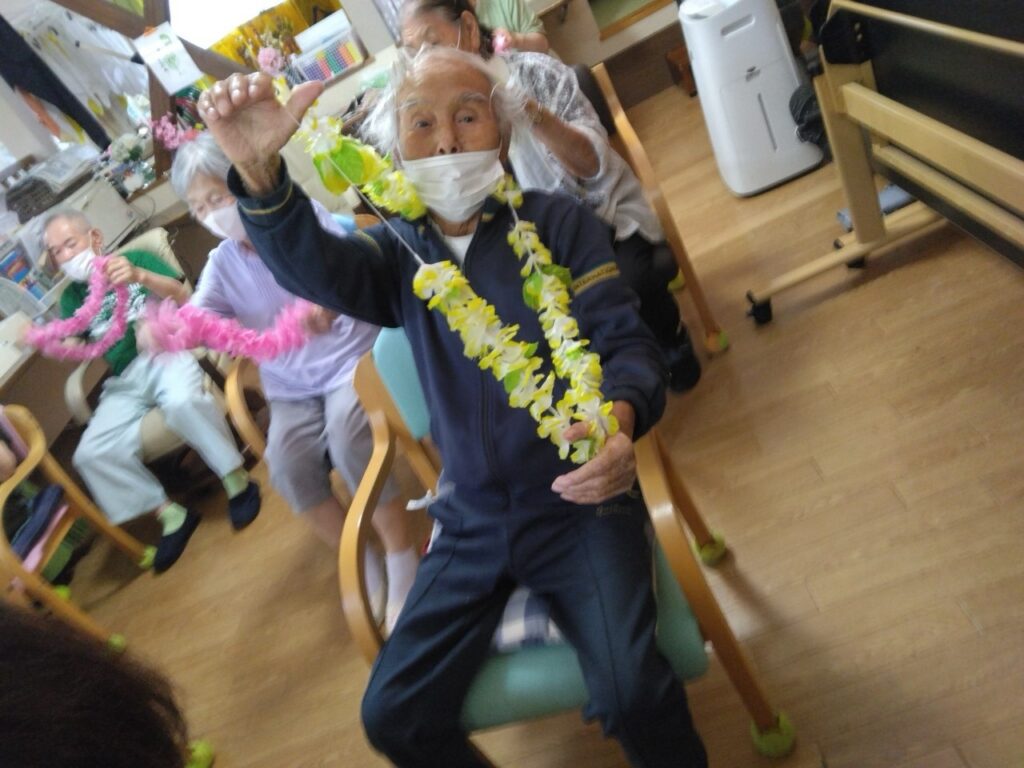皆さん、波の音を奏でたり、ハイビスカスのレイを音楽に合わせて首にかけたり、上にあげたり前に出したり上半身の運動をしました😁