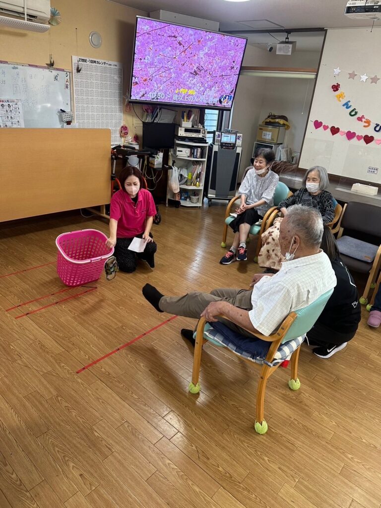 椅子に座ったままスリッパをカゴの中に入れるという簡単そうなゲームに思われますが、高さと距離感を計算し、尚且つ足の力を使って行うゲームです☆
