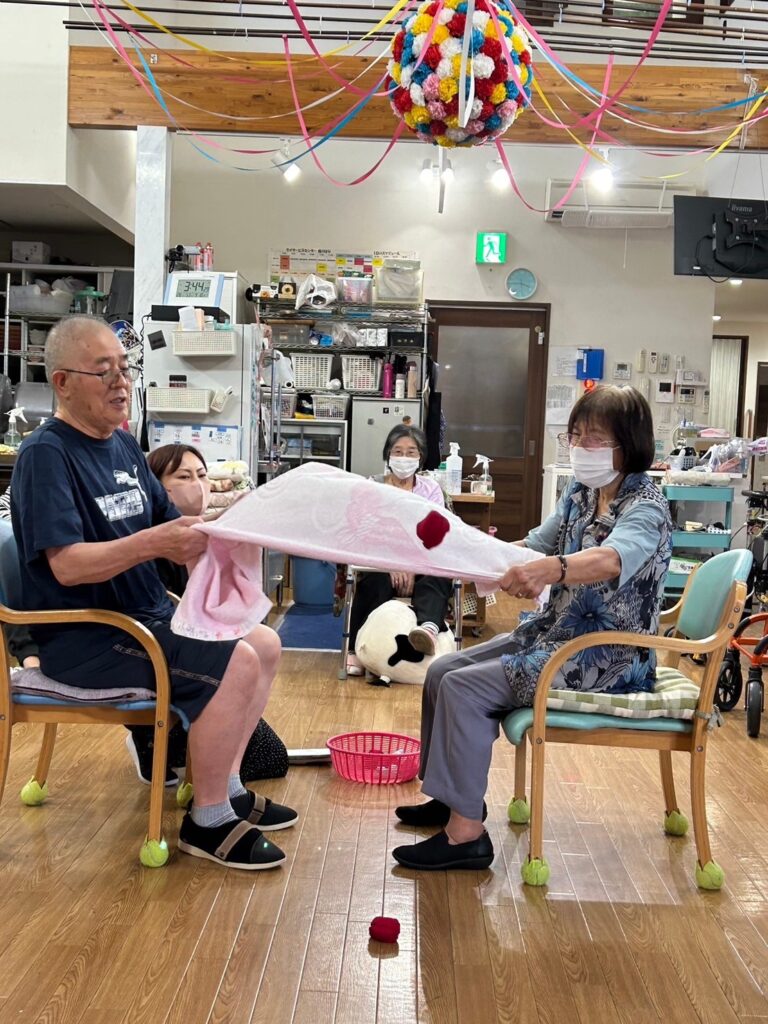 今日はバスタオルの上においた玉を投げるレクレーションをしました。