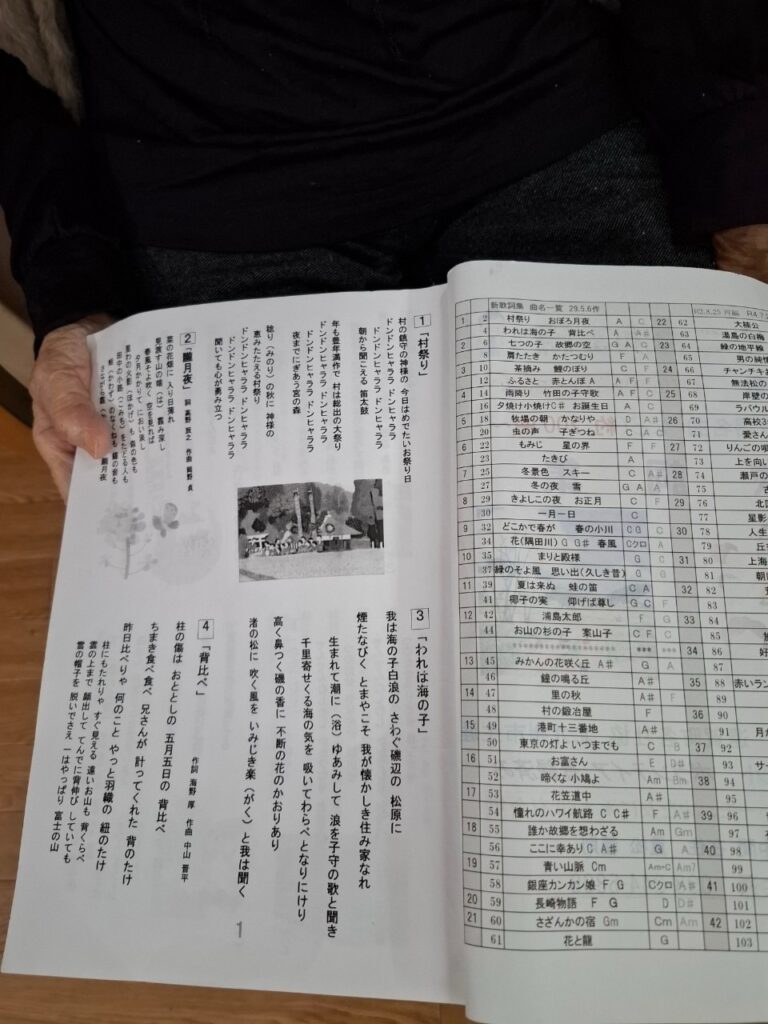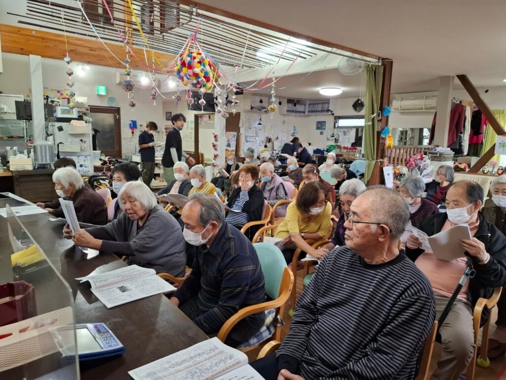 先生のハーモニカ演奏に合わせて歌詞カードを見ながら皆で声をあわせて歌います😄😄