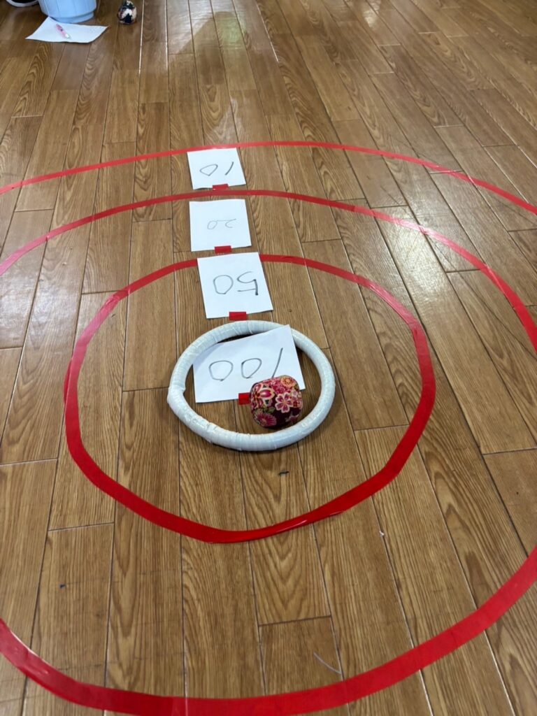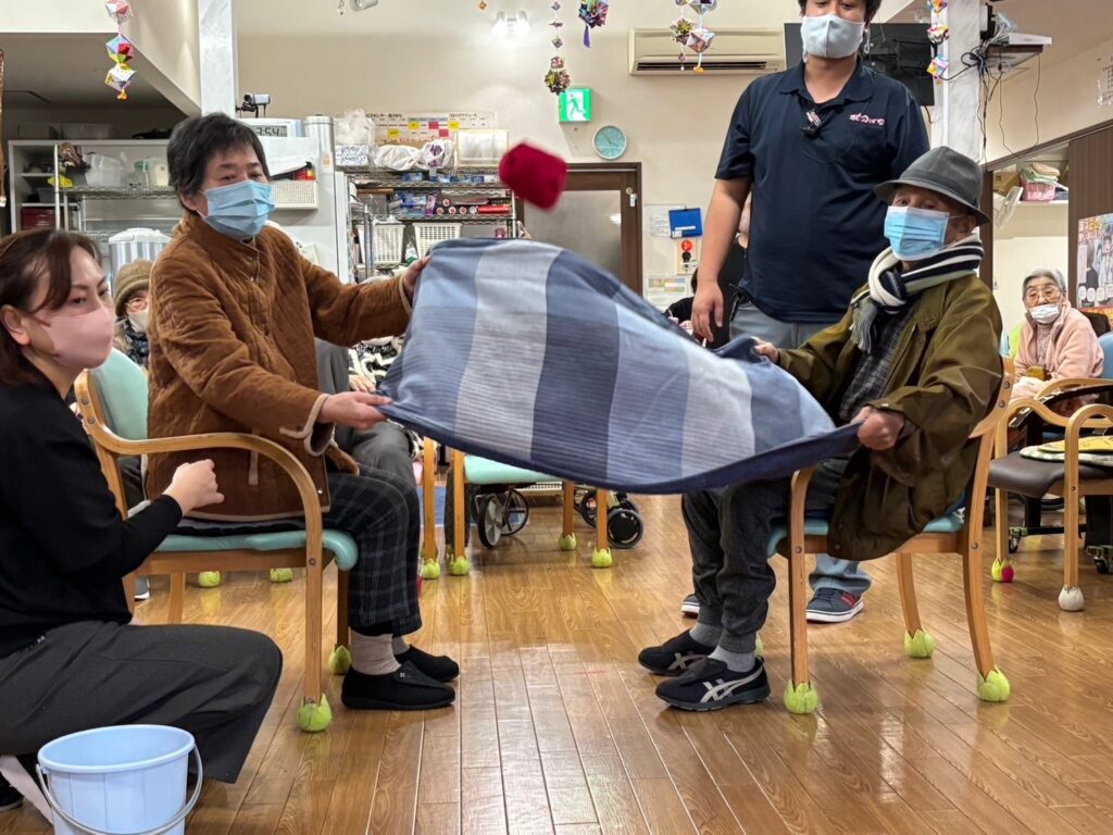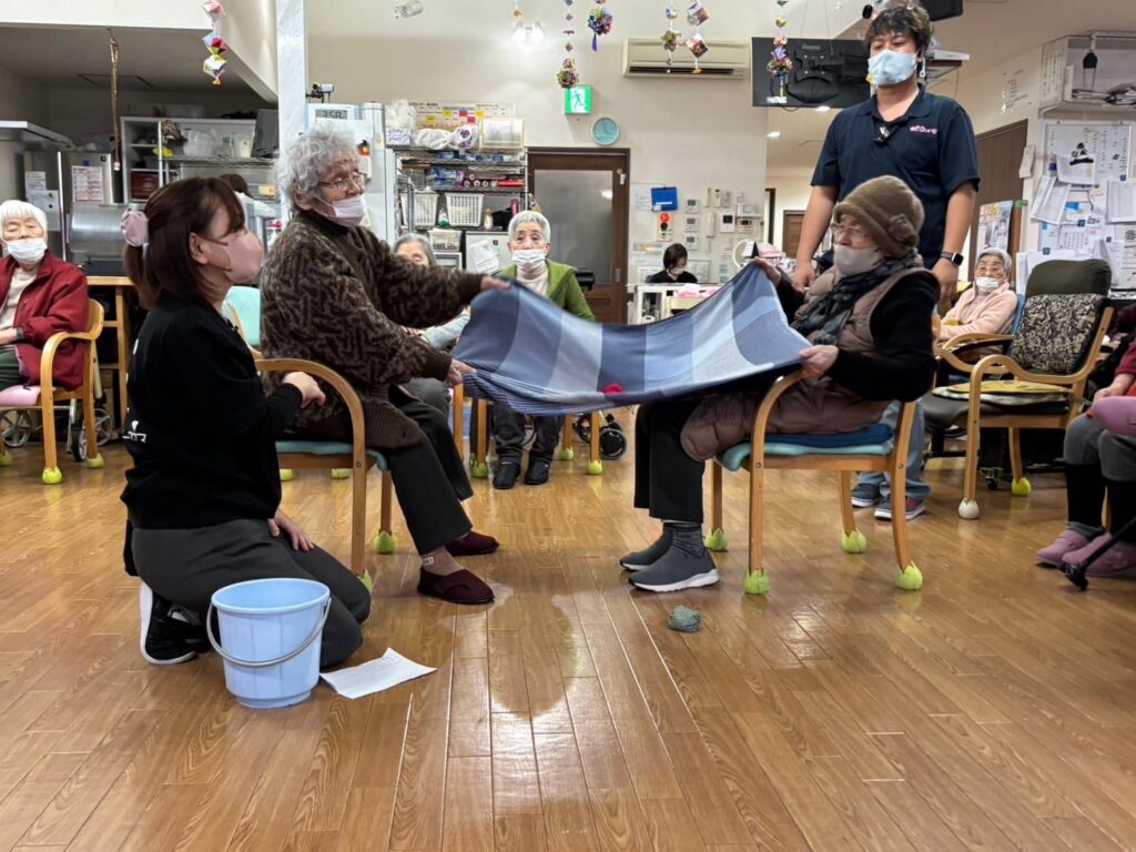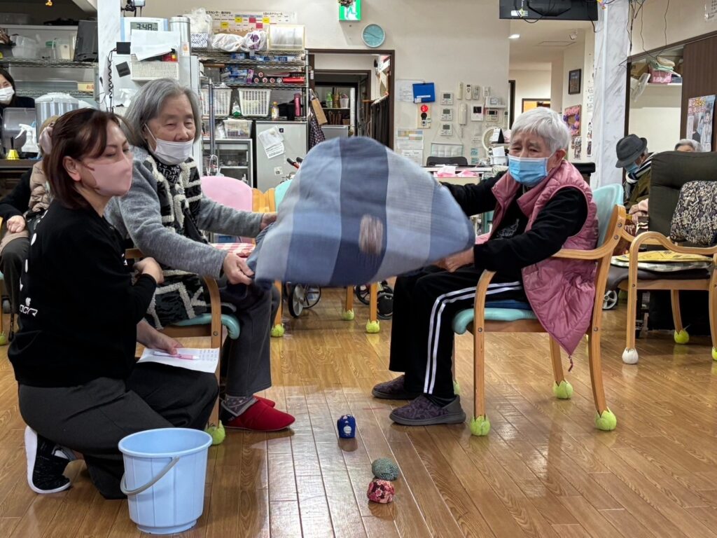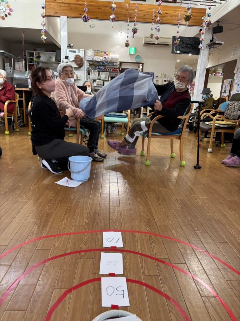 今日のレクリエーションは、2人ペアを組んで、バスタオルを使ってお手玉を飛ばして点を競うゲームをしました。
